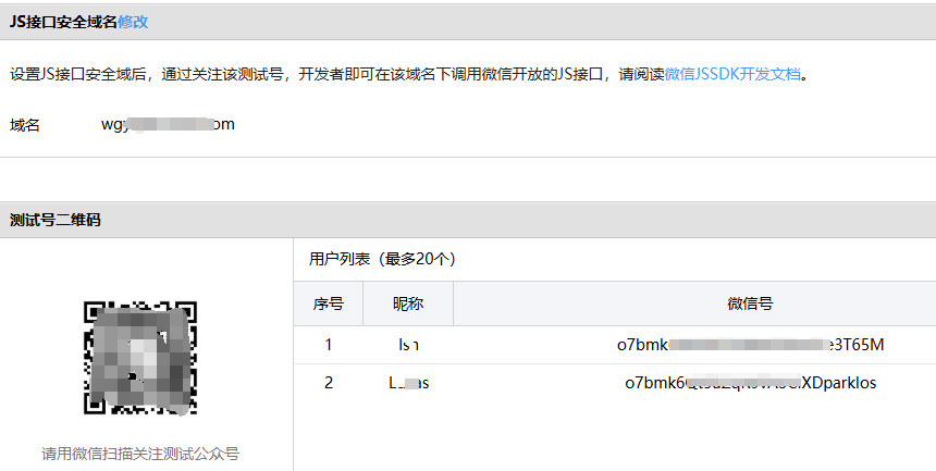 您现在的位置是:技术博客 > PHPPHP 微信公众号开发 2023-11-04 09:38【代码】14人已围观 简介微信公众号开发配置和流程。 #### 一、配置微信公众平台测试号 以企业服务号为例: 1、打开 “设置与开发” ——> “开发接口管理” ——> “开发者工具” ——> “公众平台测试账号”页面; 2、配置JS接口安全域名,网页授权接口,配置截图如下,配置的域名不要带http或者https;   3、配置好,拿到顶部自动生成的AppID和AppSecret即可; 转载:感谢您对Lucas个人博客网站平台的认可,非常欢迎各位朋友分享到个人站长或者朋友圈,但转载请说明文章出处“来源Lucas个人博客”。 很赞哦! ( 0 ) 上一篇:handsome美化 下一篇:fastadmin表单之下拉选择 相关文章 高并发库存防控超量 Swoole 基础篇一(初识) Sublime代码格式化 Session与Cookie 点击排行 生活不止眼前的苟且,还有诗和远方 十年一觉电影梦 奥地利基茨比厄尔 禅修治愈身心 自律成就自我 零边际成本社会 Modern PHP 鸟哥的Linux私房菜 本栏推荐 要技术,更要有创意 定时任务 Curl无法发送https请求 Lnmp环境搭建 常用的SQL函数 Windows的cmd指令 ueditor工具栏浮动bug 有趣的js插件 标签云 git laravel swoole javascript vue ajax html css sql linux docker flask django nginx apache thinkphp markdown sublime wechat layui photoshop nodejs mysql windows composer java maven springboot mybatis IDE 猜你喜欢 Swoole 基础篇一(初识) PHP进程管理器 正则的快速上手 Sublime代码格式化 Lnmp环境搭建 高并发库存防控超量 Linux之top命令 常用的SQL函数 站点信息 建站时间:2018-05-01 在线人数:1人 文章统计:263篇 总浏览量:223753次 统计数据:百度统计 个人信息:扫描二维码查看
